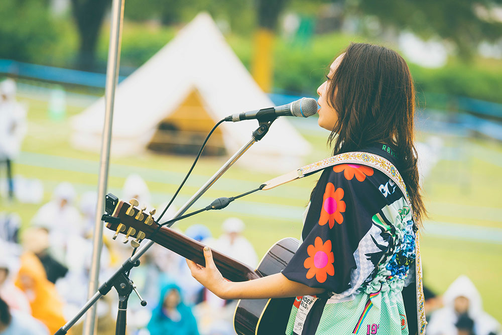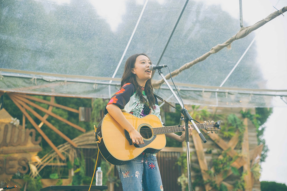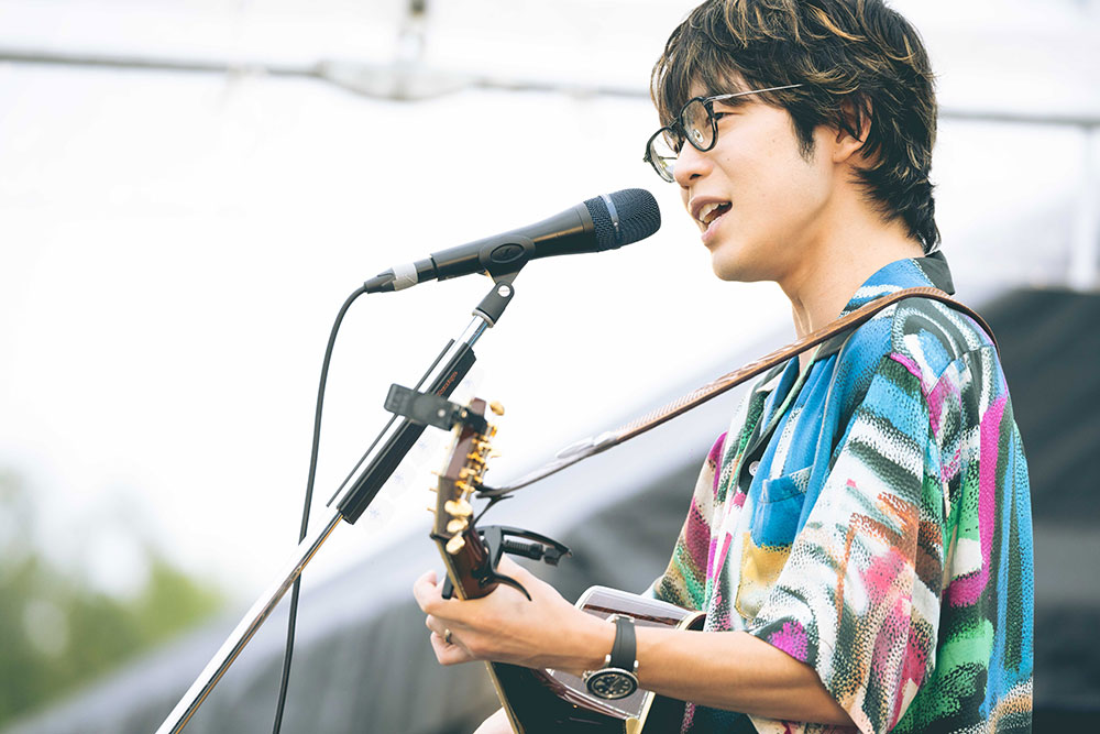 ギター1本と歌声だけ、原点ともいえるスタイルで会場を盛り上げたのが川崎鷹也だ。1曲目「カレンダー」ハスキーで深みのある歌声で観客の視線を奪うと、「ミュージック&リラックス。座りながらゆったり観られる珍しいフェス。このイベントならではの空気を楽しみつつ、自分らしく楽しんで」と、次曲「君の為のキミノウタ」へ。体温に近いような、柔らかく温かな歌声が心地よく体に浸透していく。誰かに語りかけるように、心情を込めて歌う姿にも目が離せない。