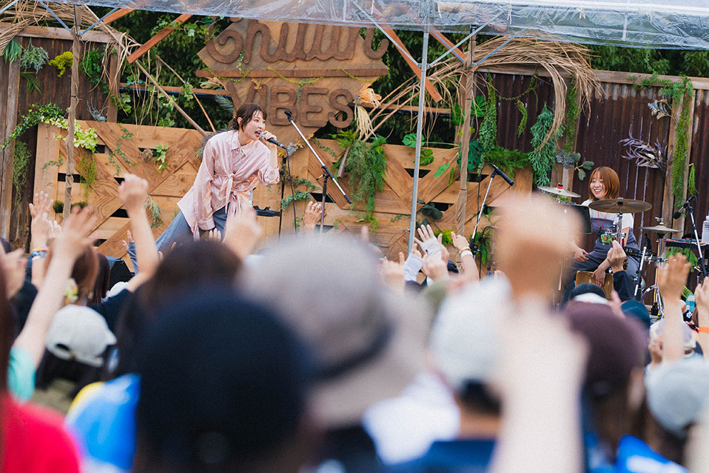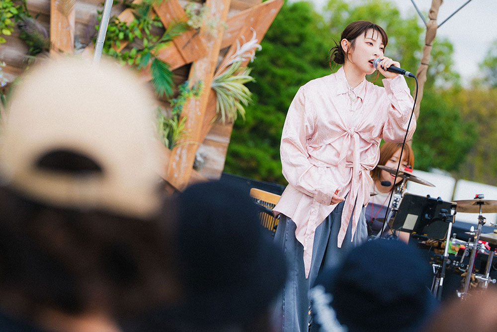 「めちゃくちゃ素敵な景色‼ 野外の会場は一人ひとりの顔がばっちり見えるし、公園だと空気もおいしい! ピクニックでみんながリラックスして聴いてる姿を見ると、生活と音楽が隣り合わせになっているのがよく分かる。音楽って良いなって改めて思える」と喜びを語る。「絶対にこのイベントで歌いたいと思っていた曲を。曇っていても、雨でも、自分の心の中は自分で晴らすことができるから。あなたの心の雨雲を歌で吹き飛ばしていけたらいいな」と、「空と青」へ。優しくて美しいメロディに乗せ、はしゃぎながら歌う彼女の姿は愛おしくて、観客の手拍子も一層大きく弾む。
